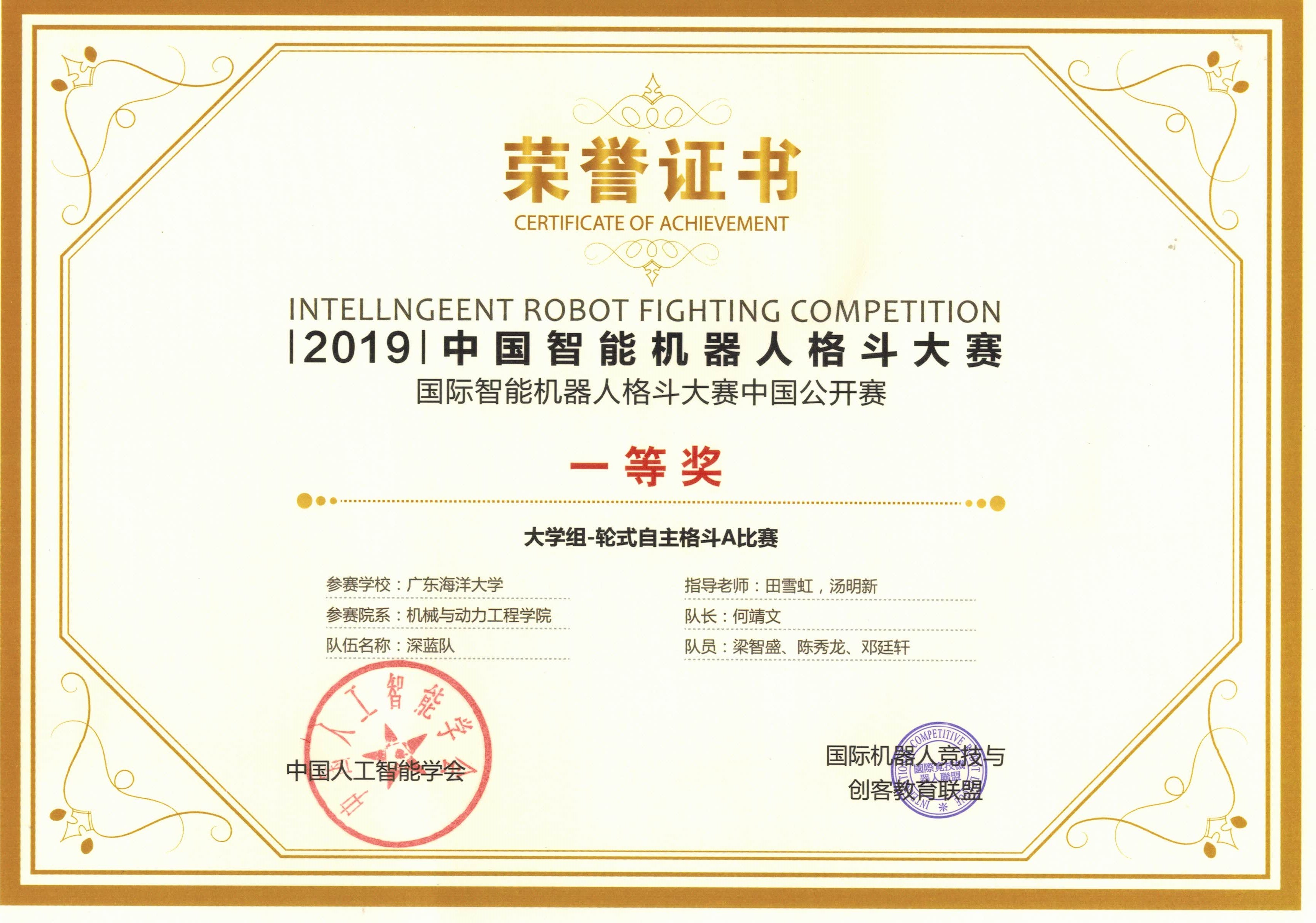 公司太阳集团tyc151的机器人创新团队(深蓝实验室)参加了大学组的轮式自主格斗,在汤明新老师、田雪虹老师的组织与指导下,由何靖文、梁智盛、陈秀龙和邓廷轩4位同学组成的队伍,代表公司参加比赛并获得了全国一等奖的好成绩。