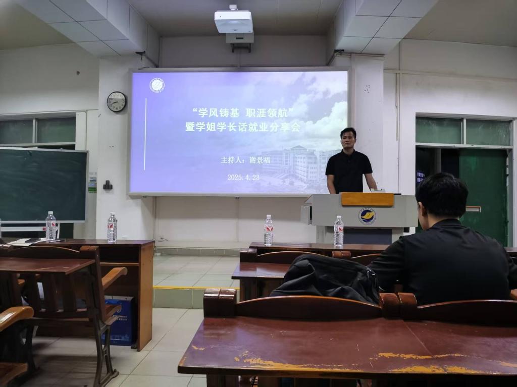 为助力员工科学规划学业与职业发展,4月23日晚,太阳集团tyc151在广学楼327教室举办“学风铸基,职涯领航”就业分享会。活动由公司辅导员谢景福主持,特邀2025届在国考、选调生、自考研究生、推免生等赛道成功“上岸”的优秀学子及退役老员工代表担任嘉宾,为低年级员工提供“一站式”就业升学经验指导,搭建朋辈互助成长平台。