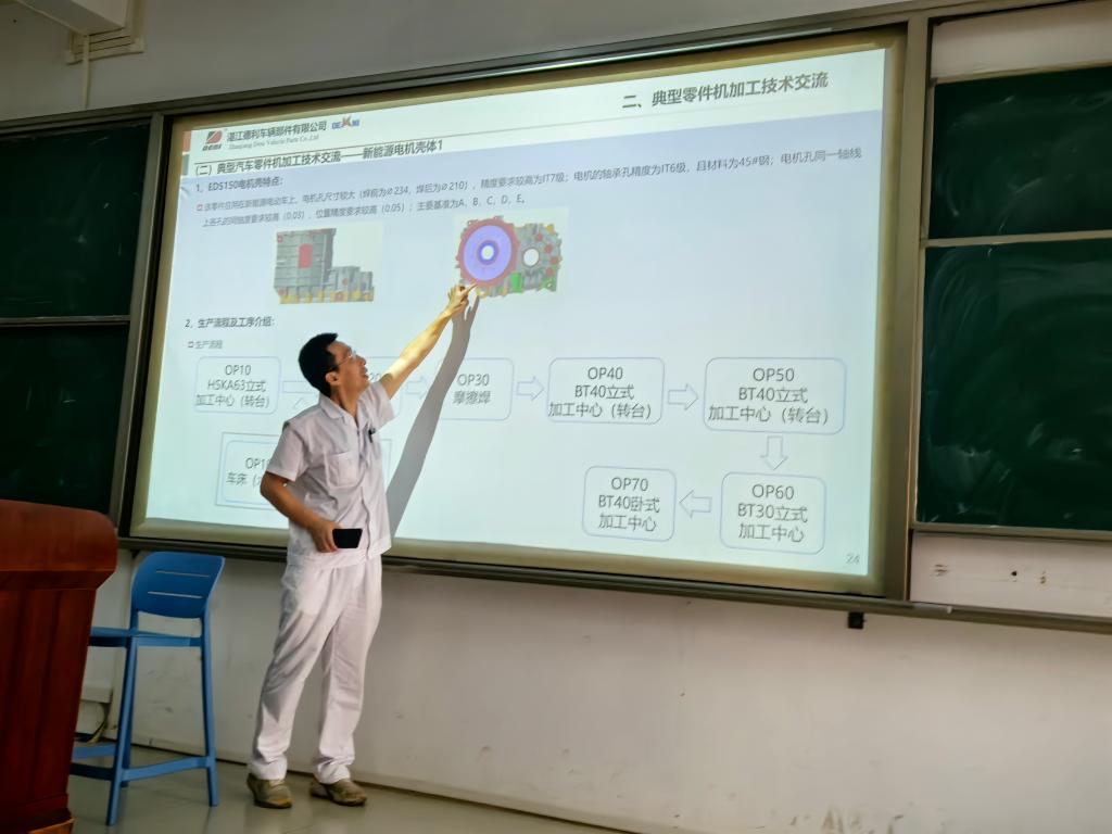 活动中,专家乔月忠对企业主要零部件进行展示,并以EDS150电机壳体、新能源电机壳体为代表,系统讲解了零件机加工的全流程工艺设计。从材料选择、基准面铣削,到精加工阶段的坐标磨削与三坐标检测,专家结合生产实例,生动解析了工艺规划中的关键点,并特别强调了“工艺稳定性”对产品质量的重要性,并以实例讲授反镗刀使用、在线测量技术的应用等高精度技术保障措施的应用。