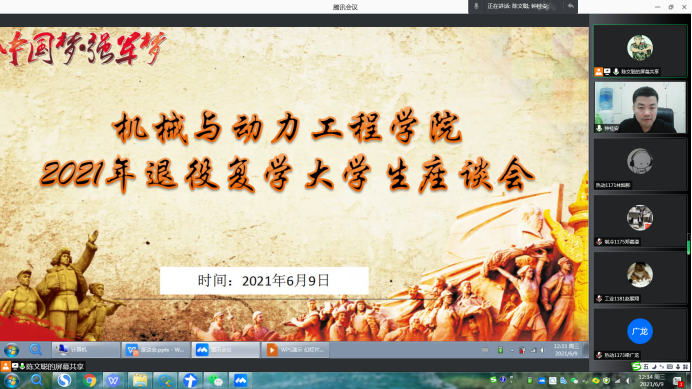 为庆祝中国共产党成立一百周年,深入推进党史学习教育,开展“我为群众办实事”实践活动,做好退役复学老员工服务工作。6月9日中午,机械与动力工程公司党委副书记钟桂安通过腾讯会议,主持召开了退役复学老员工座谈会。公司征兵专项工作老师陈文聪、在校退役复学员工等10多人参加了座谈会。