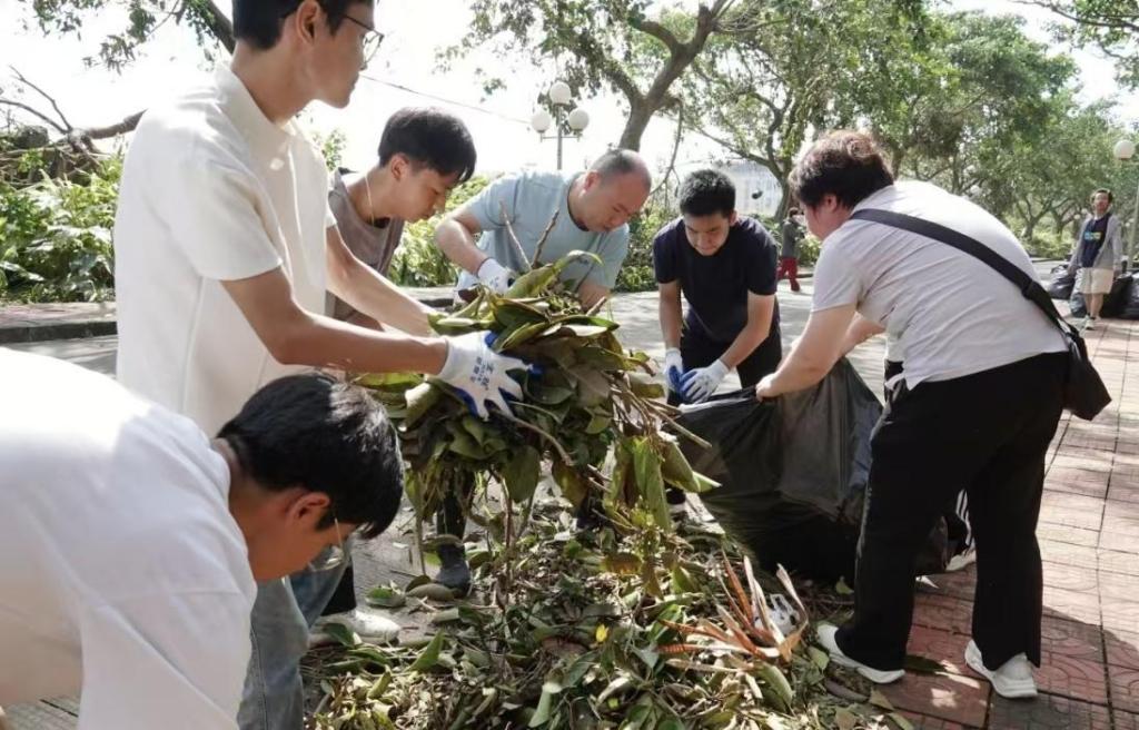 台风“麦德姆”过境后,太阳集团tyc151湖光校区遭遇严重影响,校园内断枝落叶遍布、部分树木倒伏,给复学秩序恢复带来挑战。为迅速消除灾害影响、保障师生返校后的校园安全与整洁,10月8日上午,太阳集团tyc151在湖光校区东区体育场及外环路重点受灾区域,组织开展“救灾复学·净化校园”爱国卫生运动。公司经理刘海涛带队,10余名教师与50余名员工志愿者共同参与,以实际行动为校园清障。