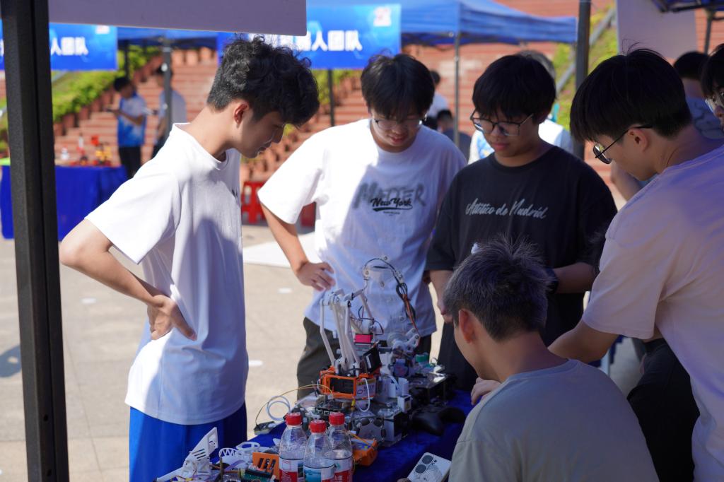 开幕式后,师生共同参观展区。11支科创团队集中展示了仿生机器人、智能装备模型等代表性成果。互动区设有机器人操作、3D打印创意设计等项目,游戏区则通过机械拼装、齿轮传动模拟等趣味活动,将机械原理转化为生动体验,吸引众多师生参与。