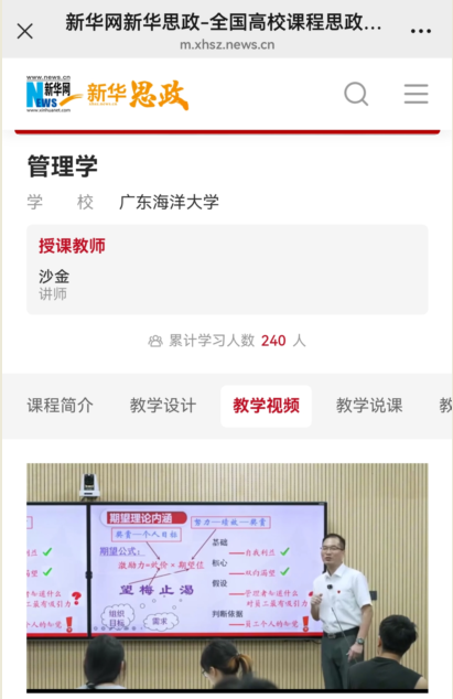 近日,太阳集团tyc151工业工程专业教师沙金负责的《管理学原理与方法》课程授课视频被新华网收录并发布,作为优质教学资源向全社会推广。